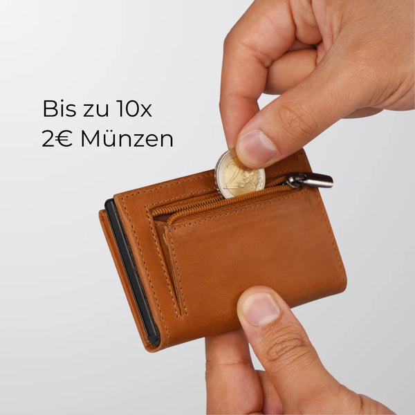 Hinweis: Aufgrund der Materialeigenschaft von Leder ist das Leder am Münzfach steif und kann dadurch zunächst klein wirken. Mit der Nutzung des Münzfaches dehnt sich das Leder ohne Verlust an Wertigkeit jedoch aus, sodass sehr viele Münzen im Münzfach angenehm verstaut werden können.